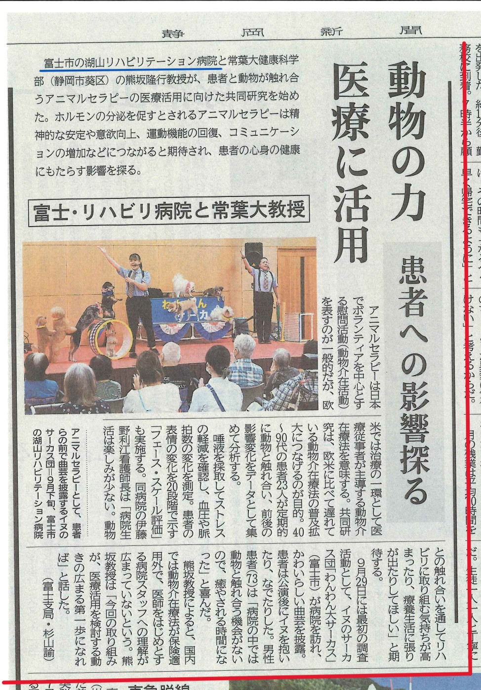 2025.10.08 静岡新聞掲載 常葉大学健康科学部の熊坂隆行教授との共同研究による「アニマルセラピーの医療活用」に向けた取り組みが紹介されました。