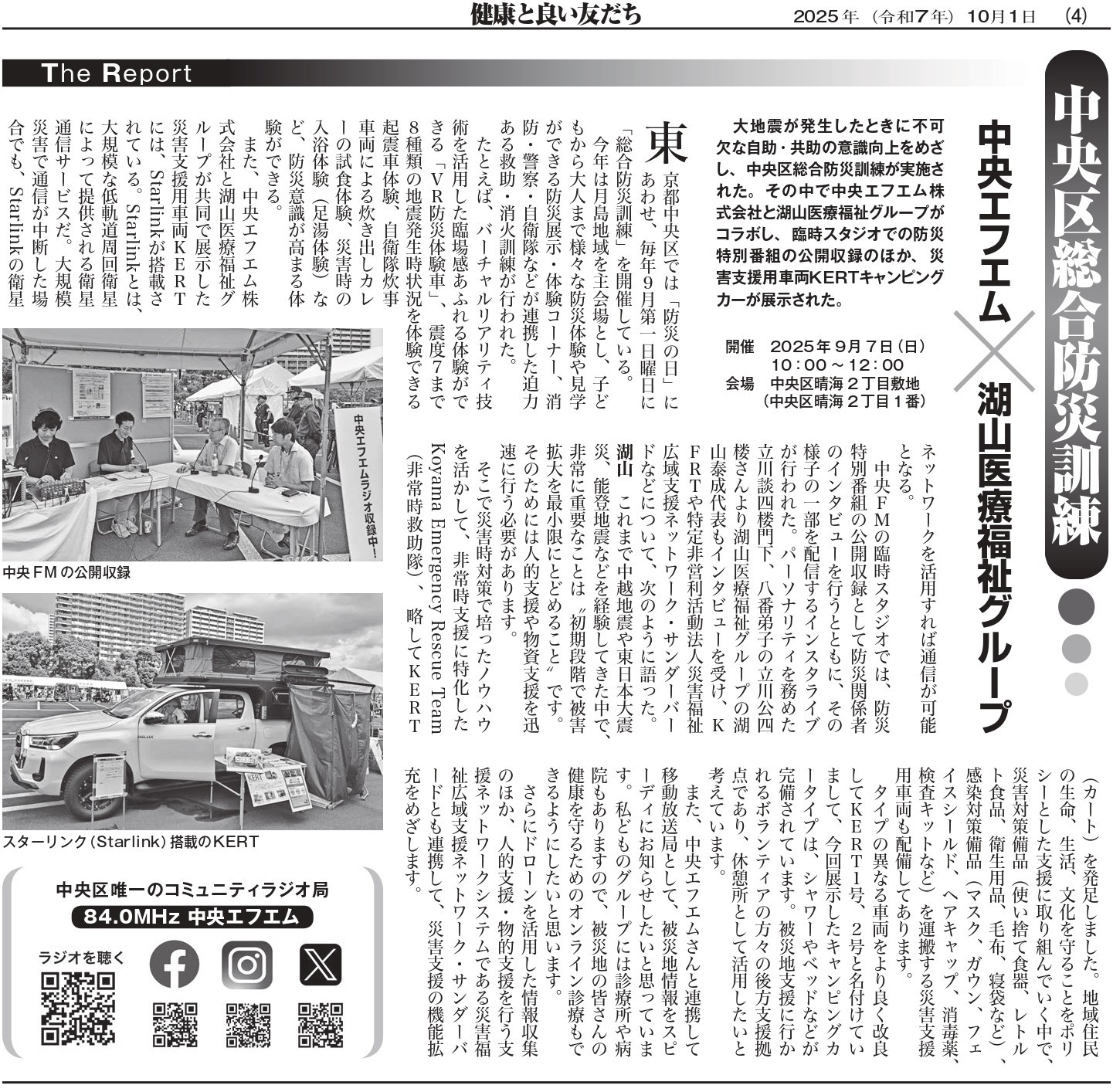 2025.10.01 新聞掲載のお知らせ <中央区総合防災訓練> コラボ番組公開収録! 中央エフエム×湖山医療福祉グループがコラボ番組を9月1日に臨時スタジオで公開収録 健康と良い友だちより掲載