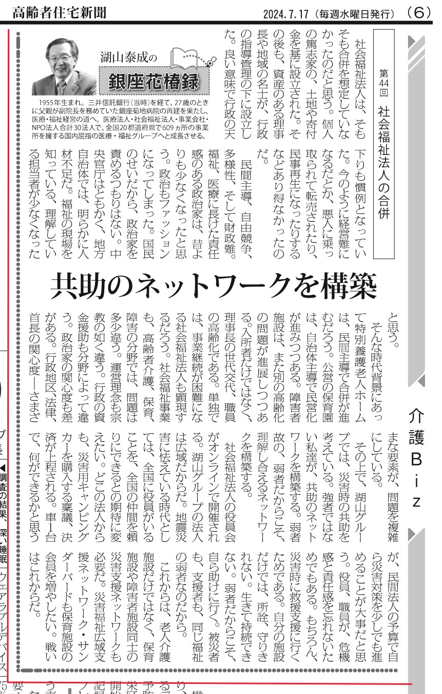 2024.07.17~ 高齢者住宅新聞連載<湖山泰成の銀座花椿録>第44回・45回・46回をご紹介