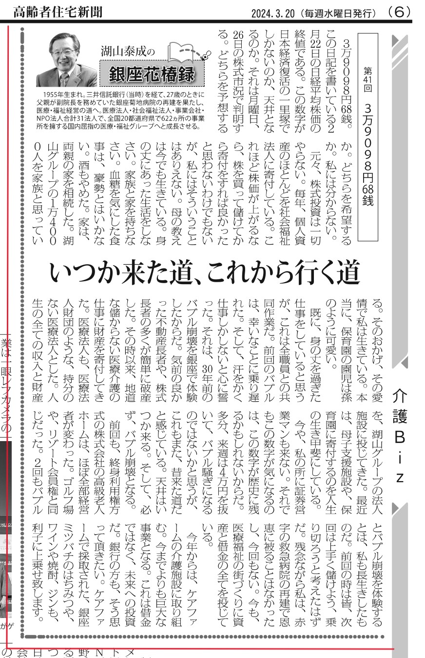 2024.02.21~ 高齢者住宅新聞連載<湖山泰成の銀座花椿録>第40回・41回をご紹介