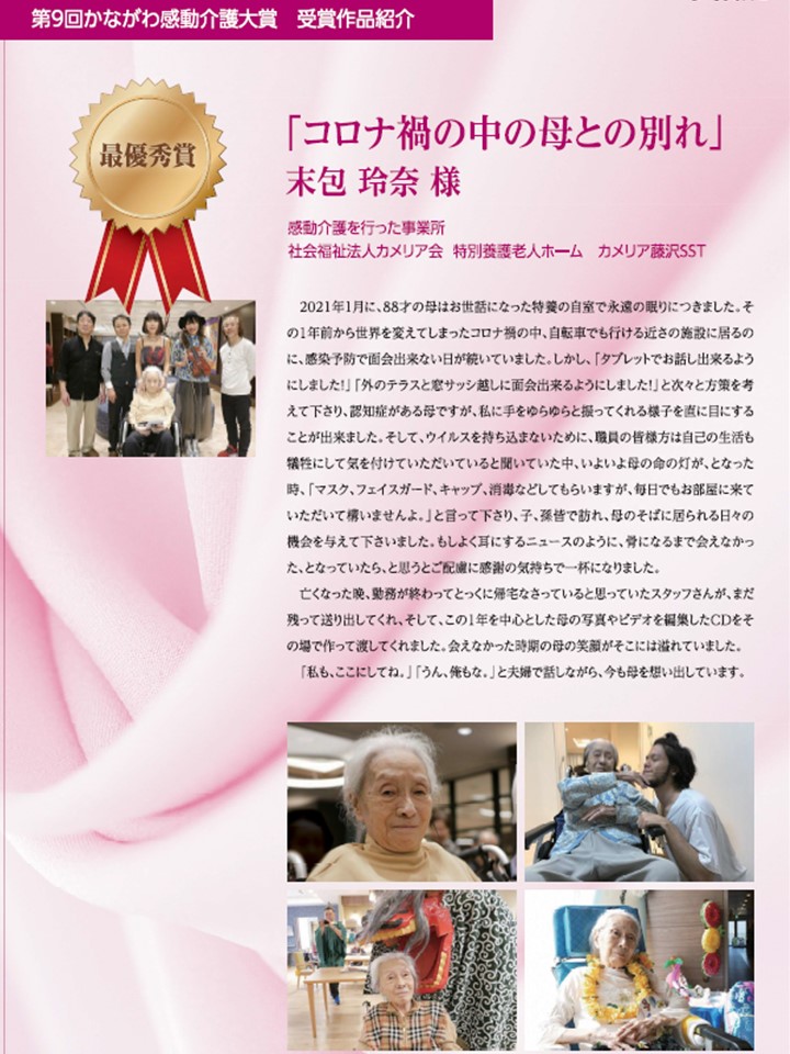 この度、特別養護老人ホームカメリア藤沢SSTが【第9回 かながわ感動介護大賞】の最優秀賞を受賞しました。